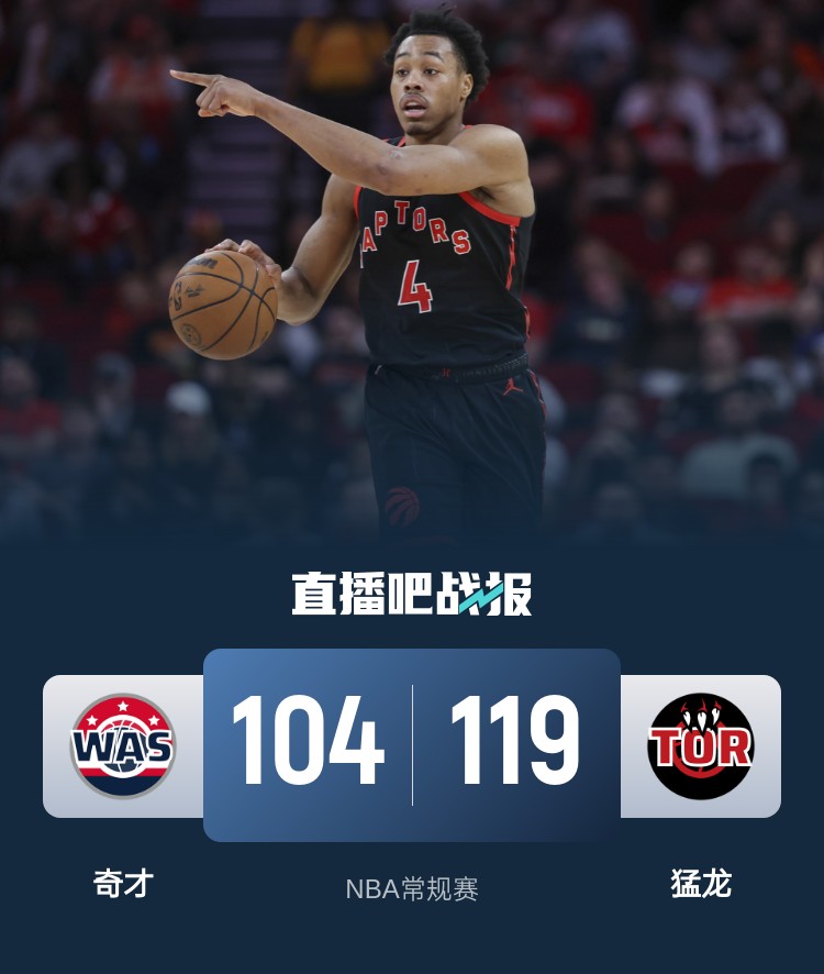 上半场,两队开场便陷入缠斗,比分交替领先,猛龙多点开花,奇才连投带罚不断拿分,双方大打对攻,AJ-劳森高效发挥,奇才连中三分还以颜色,半场战罢奇才60-59领先猛龙1分。下半场,奇才命中率骤降,猛龙持续发力单节净胜15分,末节猛龙稳扎稳打继续扩大优势,奇才苦苦追赶无果。最终,猛龙119-104击败奇才,主场过关。