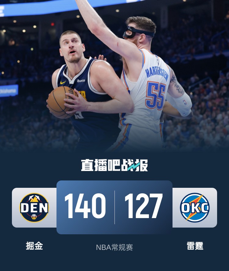 比赛开始,双方上来迅速进入状态展开对攻战,哈滕和约基奇在内线对飙,亚历山大中投还是很稳一度带队反超比分,皮克特三分帮助掘金首节领先2分,次节双方在外线又展开对飙,比分交替领先,雷霆多点开花打出小高潮建立主动权,杰伦威受伤离场,约基奇有攻有传追到差6分。下半场,双方还是展开拉锯战,穆雷里突外投还是保持不错状态,亚历山大和多特连续三分能回应,约基奇三分追平,穆雷两罚反超2分,末节掘金接连6记三分拉开双位数领先,多特能外线回应,但约基奇连续取分稳住领先,最终掘金140-127复仇雷霆,终结对手7连胜。
