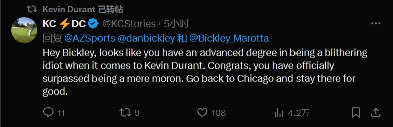 球迷三:嘿,看来你在"如何成为关于凯文-杜兰特的胡说八道专家"这方面已经获得了高等学位。恭喜你,你正式超越了一个普通的白痴。赶紧滚回芝加哥,永远待在那儿吧。