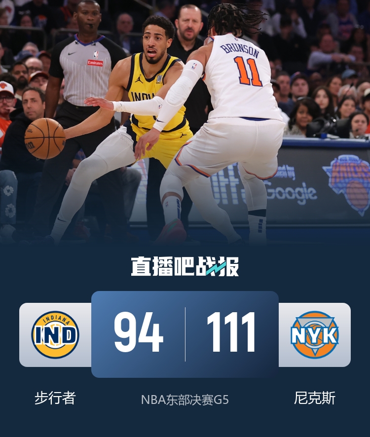 比赛开始,布伦森上来手感火热,里突外投半节多便砍下12分,尼克斯顺势建立双位数领先,随后步行者替补上来连中三分首节追到差4分,次节西亚卡姆带队追分,但尼克斯连续冲击打成2+1回应,唐斯连续内线强打单节上双,尼克斯拉开双位数领先。下半场,布伦森继续发力连砍8分扩大领先,布拉德利受伤离场,唐斯再突破拉开20分以上领先,步行者8-0终于止血,步行者开始砍米切尔-罗宾逊,但布伦森带队回应8-0强势稳住十几分领先,末节步行者继续追分,但哈特连续内线打成再次回应,尼克斯始终保持住十几分领先,最终尼克斯111-94击退步行者,大比分扳成2-3。