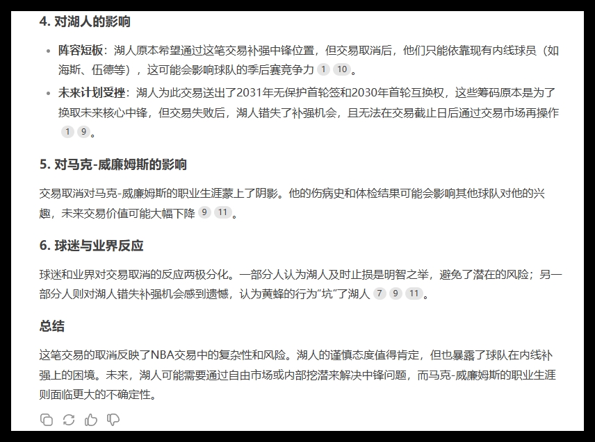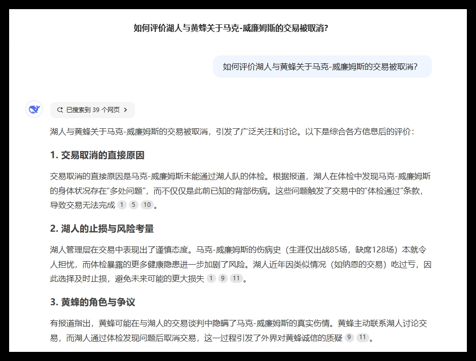让近期火热的国产人工智能平台DeepSeek对湖人黄蜂取消有关马威交易一事进行点评,看看它会怎么说: