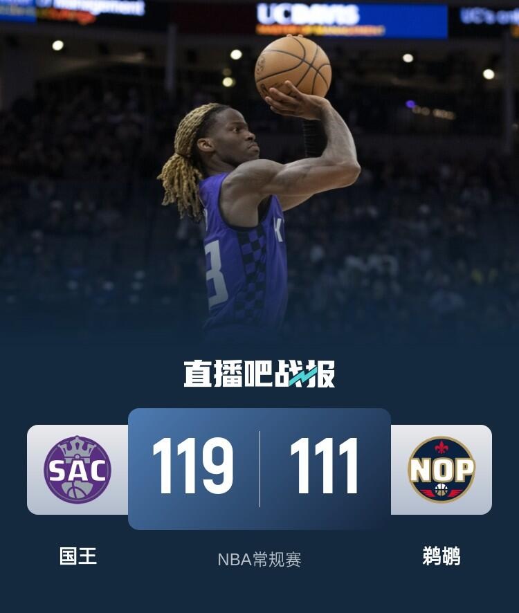 国王(28-26):埃利斯27分5板1助,德罗赞24分4板6助,拉文23分3板7助,蒙克17分4助4断2帽,小萨博尼斯16分15板5助2帽,基根-穆雷6分7板5助1帽,瓦兰丘纳斯5分4板1断2帽
