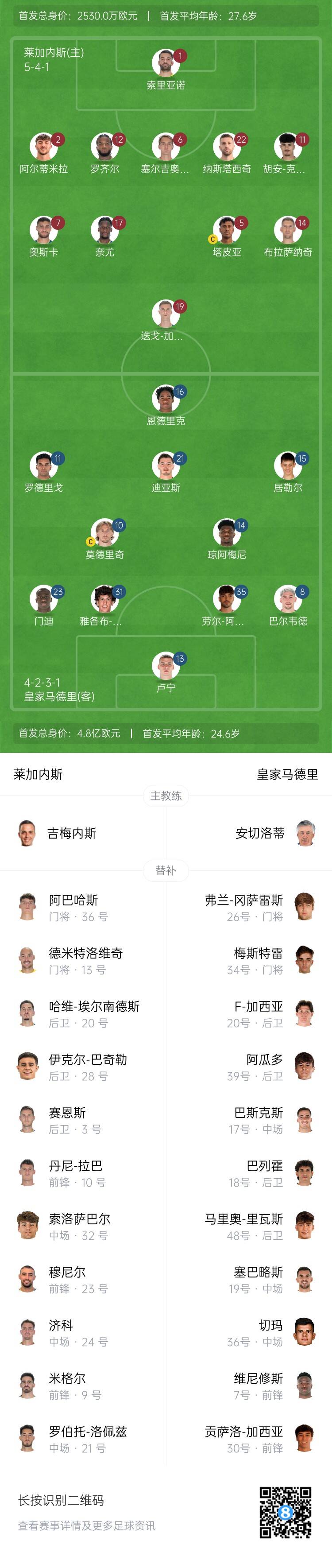 莱加内斯替补:13-德米特洛维奇、36-阿巴哈斯、3-豪尔赫-萨恩斯、9-米格尔-德拉富恩特、10-丹尼-拉巴、20-哈维-埃尔南德斯、21-罗伯特-洛佩斯、23-穆尼尔、24-朱利安-济科、28-伊克尔-巴奇勒、32-索洛萨巴尔
