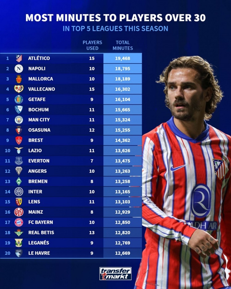 4月25日讯 德国转会市场统计了本赛季五大联赛球队年龄30+球员的出场总时间,并列出榜单,马竞居首,那不勒斯次席。