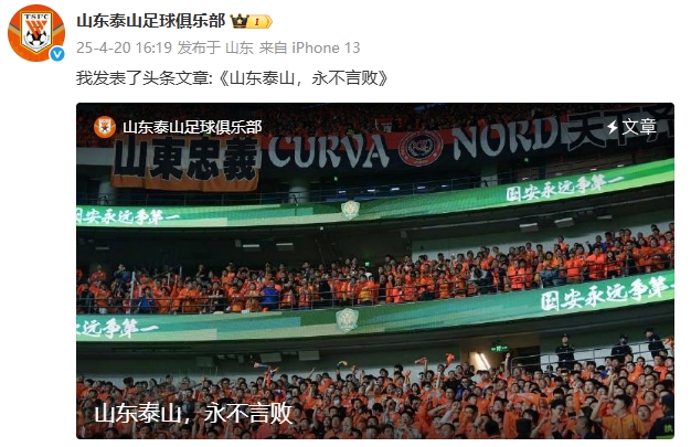 一场失利不会击垮我们,它会让我们更清醒地认识到自身的不足。泰山队有着辉煌的历史和深厚的底蕴,我们相信,在俱乐部的领导下,在教练组、队员和球迷的共同努力下,球队一定会用更好的表现回报大家的支持。山东泰山,永不言败!