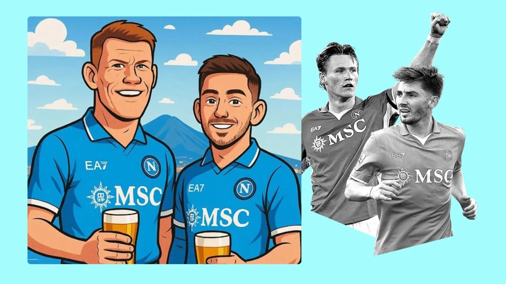 如今那不勒斯支持者对苏格兰元素热情十分高涨,以至于活动宣传画竟出现了麦克托马奈和吉尔莫身穿天蓝色队服、套着苏格兰短裙、手持啤酒杯的卡通形象。