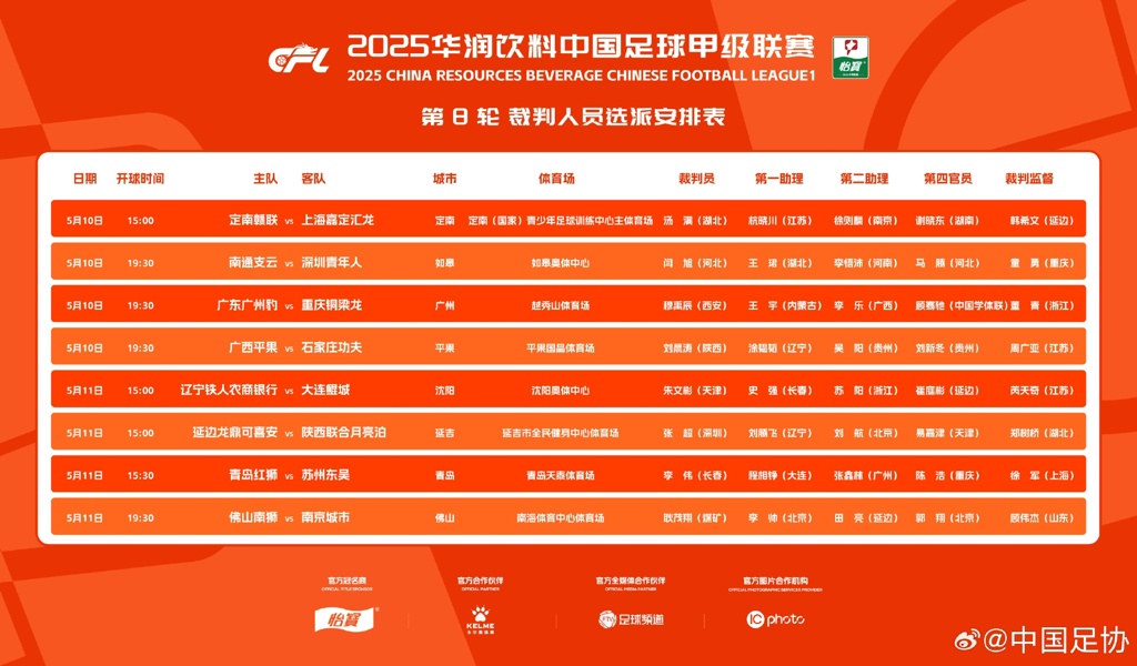05月10日讯 中国足协公布了中甲第8轮裁判人员选派名单,穆禹辰执法广州豹vs重庆,朱文斌执法辽宁vs鲲城,具体名单如下: