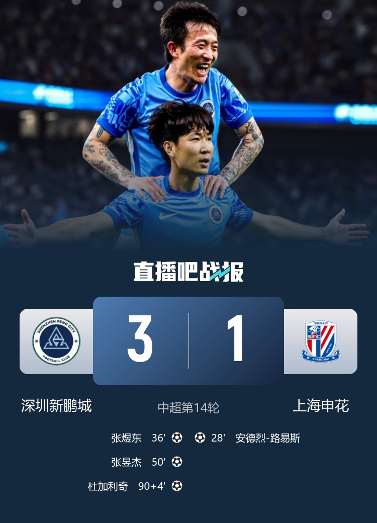 6月14日讯 北京时间6月14日晚上19:35,中超第14轮,深圳新鹏城坐镇深圳体育中心迎战上海申花。上半场,王峤门线极限救险,安德烈-路易斯远射破门,张煜东世界波,安德烈-路易斯两连击进球被吹。下半场,张昱杰凌空抽射反超,米内罗伤退,杜加利奇锁定胜局。全场结束,深圳新鹏城3-1上海申花。本场过后,上海申花积32分继续排名榜首,深圳新鹏城积分14分升至第13。