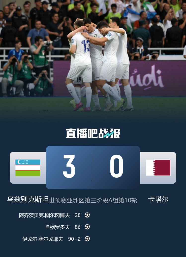 全场比赛结束,乌兹别克斯坦3-0击败卡塔尔。