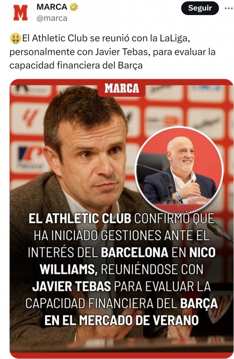 “根据被泄露给毕尔巴鄂的机密信息,出现了尼科-威廉姆斯要求以解约金条款形式提供额外担保的情况。巴萨明智行事,不愿接受该条件。”