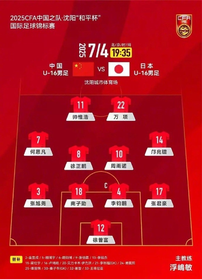 跟大家简单普及一下,沈阳‘和平杯’吧!2024年,2008年龄段的U16国足首次参加了沈阳‘和平杯’国际足球锦标赛。三场比赛中,U16国足首战4比0大胜越南队,次战1比2负于日本队,最后一场2比1击败乌兹别克斯坦队,以2胜1负进7球失3球的战绩拿到了冠军。这回咱们可以好好期待一下小伙子们的表现啦!”